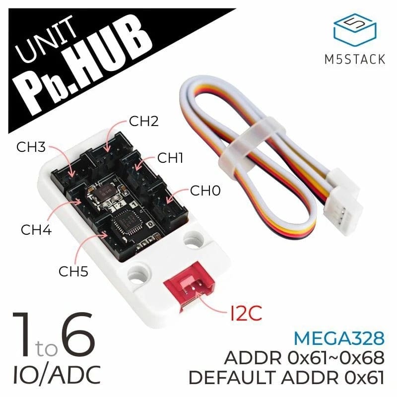 GroveコネクタのI2Cインタフェース(M5StackのPort.A)を使い、最大6系統のPort.B(GroveコネクタのGPIOとアナログ入力)を拡張できるユニットです。6系統のGPIOをマイコン(MEGA328)で変換し、I2Cで通信する仕組みです。